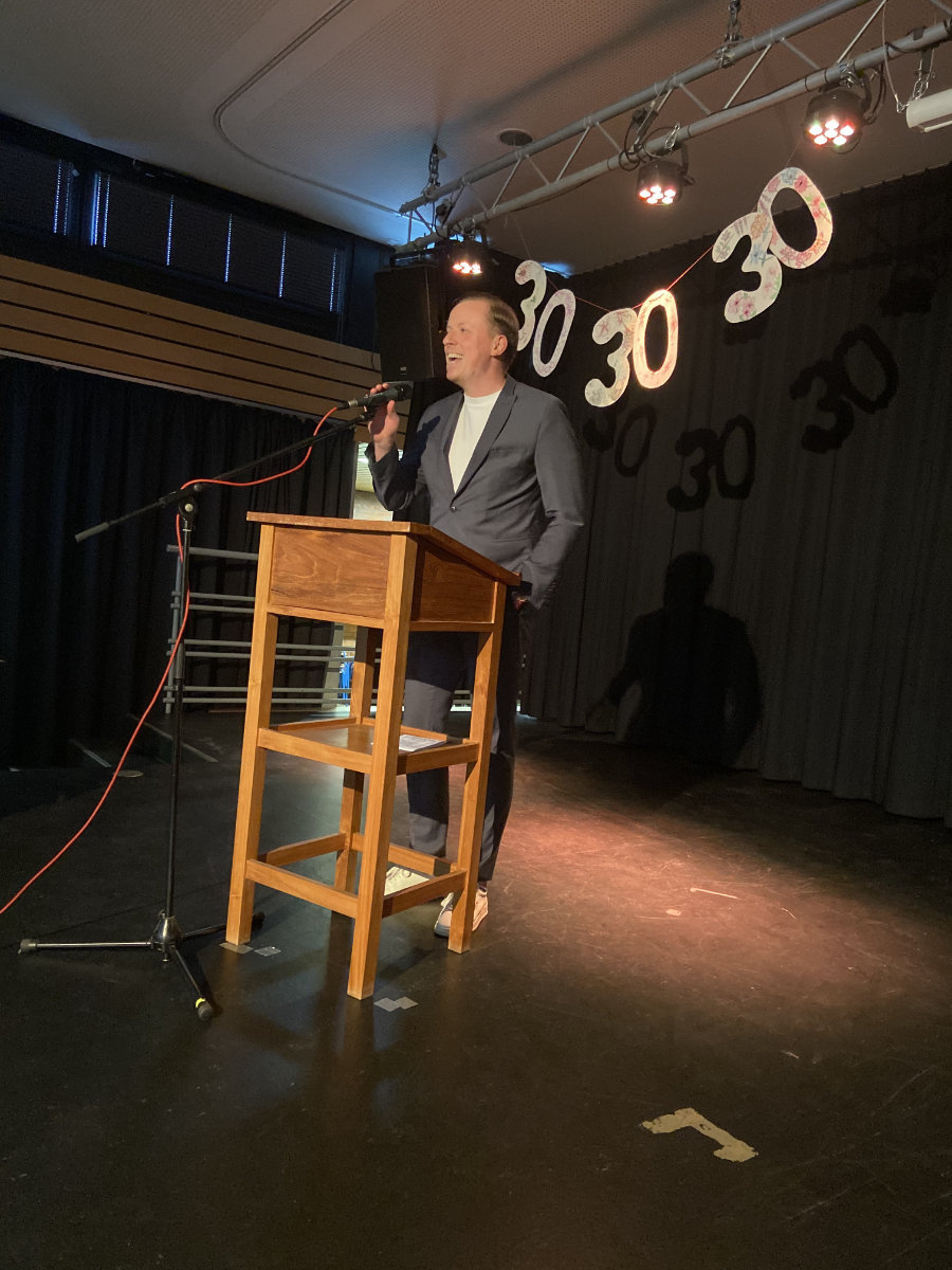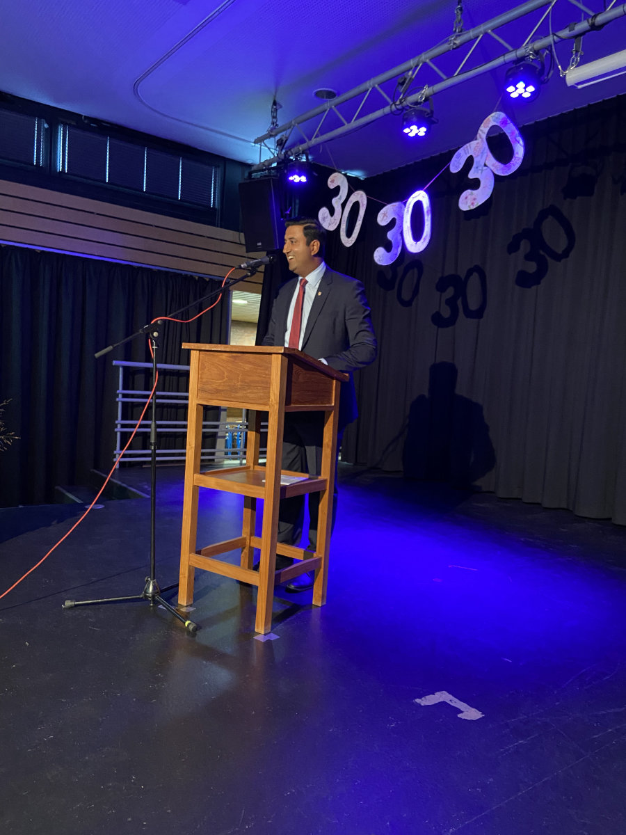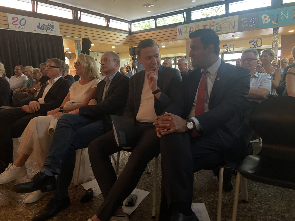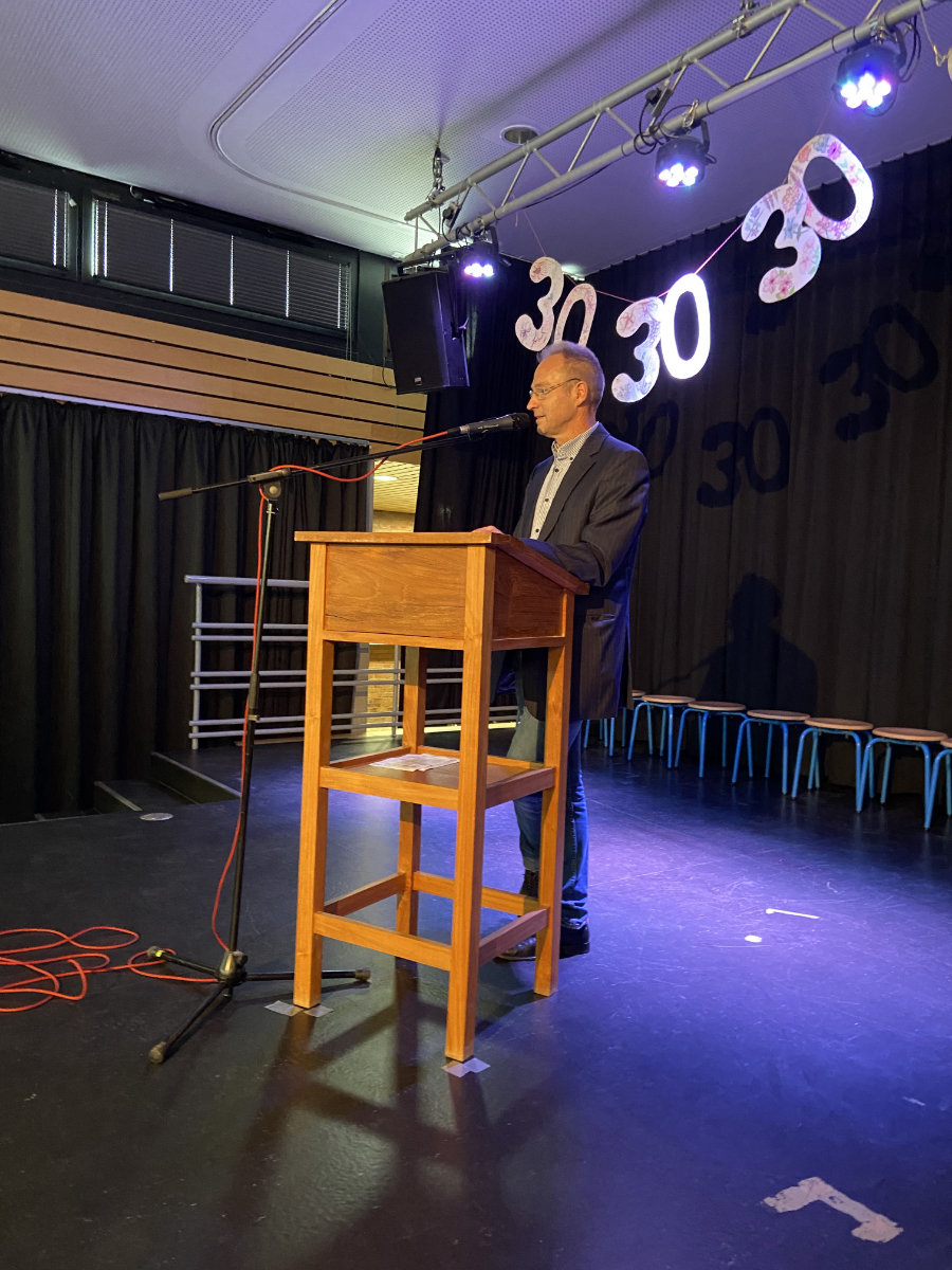Am Abend wurde mit Gästen aus Bildung, Politik und Gesellschaft und natürlich vielen ehemaligen Lehrkräfte gefeiert. Unser Oberbürgermeister Berit Onay ließ es sich nicht nehmen, an diesem Abend ein paar festliche Worte zu sprechen, genauso wie der Bezirksbürgermeister Dr. Wjahat Waraich, der Bundestagsabgeordnete Adis Ahmetovic und die Dezernentin Frau Wullstein vom RSLB. Die Reden würdigten das Engagement von Lehrkräften, Schülern und dem ehemaligen wie jetzigen Schulteam und setzten Akzente auf Werte wie Lernfreude, Gemeinschaft und Chancengleichheit. Die ganz persönliche Schulerfahrung der Redner blieb dabei nicht außen vor - sehr zur Freude des Publikums!