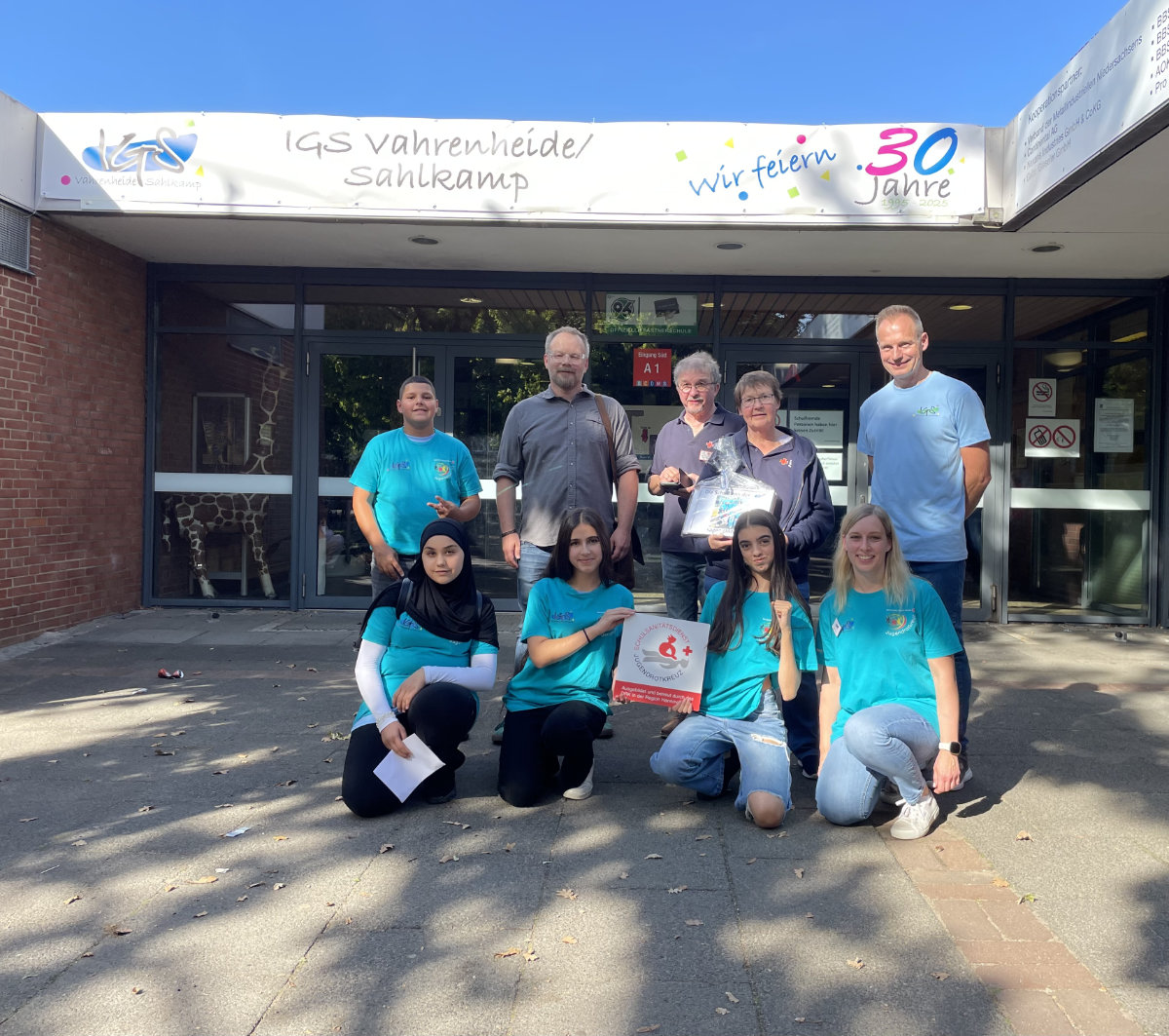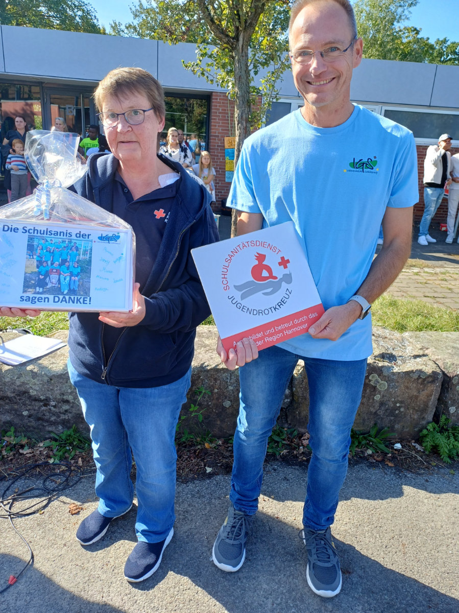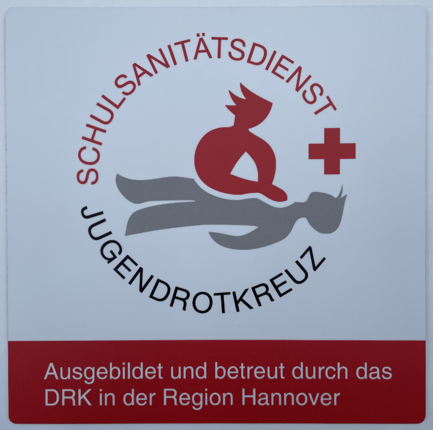 Als Auszeichnung für die Kooperation unserer IGS Vahrenheide/Sahlkamp mit dem Jugendrotkreuz (JRK) überreichte Frau Gloger-Netzel unserem Schulleiter, Herrn Kleinholz-Mewes, das Schild für unseren Schulsanitätsdienst. Mit der Anbringung des Schildes möchte das JRK den Schulsanitätsdienst sichtbarer machen. Damit sind wir jetzt auch offizielle Partnerschule. Wir sind stolz darauf und sagen dem DRK und besonders Frau Eva-Maria Gloger-Netzel: DANKE !!!