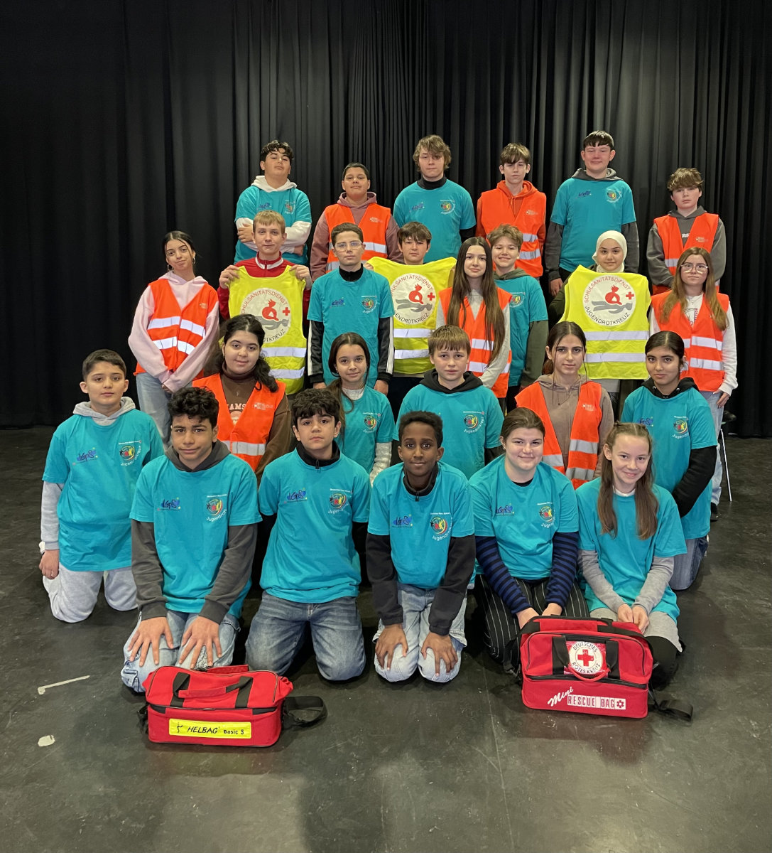 Auf dem Gruppenfoto sind alle alten und neuen Schulsanitäter*innen zu sehen. Die alten Schulsanis aus Jahrgang 8 und 10 tragen die orangefarbenen bzw. gelben Westen. Die neuen Sanis aus Jahrgang 7 haben die vom DRK gesponserten petrolfarbenen T-Shirts an. Jetzt fühlen sich alle wie richtige Sanis!